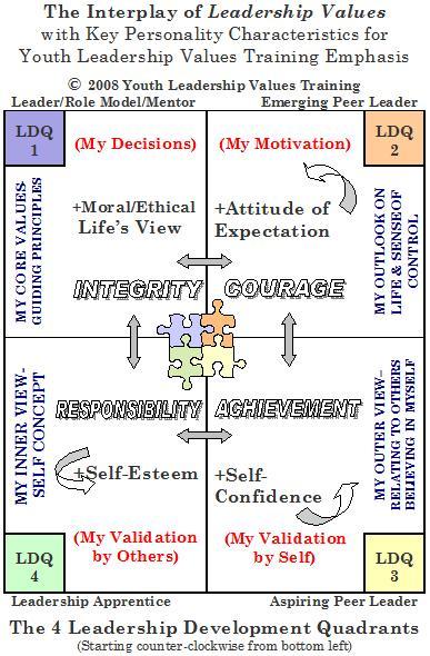 That said, do keep in mind the beauty of emphasizing the Leadership Core Values of Integrity, Achievement, Responsibility, and Courage vis-a-vis the four steps outlined on this web site, Youth Leadership Values Training. This affords for you a concentrated and "manageable" approach that is easy to conceptualize and implement - and it lends itself to possible inclusion of "supporting values" for secondary emphasis and discussion on an ad hoc basis.