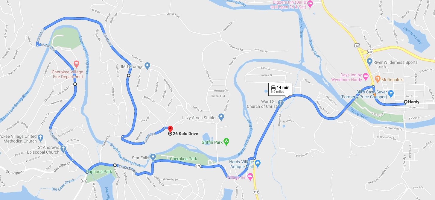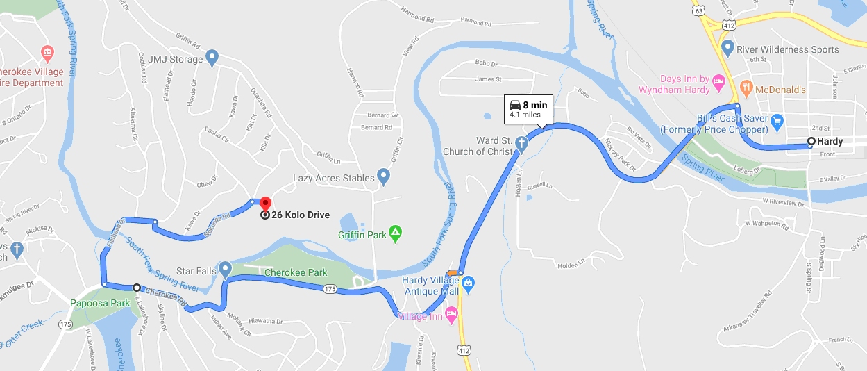 In the event the Flathead Drive bridge is also closed, continue on State Highway 175 just past Town Center and turn right onto Cherokee Road (across from Papoose Park). Continue past the Cherokee Village Fire Department. After crossing the river turn right onto Flathead Drive. Turn left onto Nokonda Drive. ![]() Follow this route if the Flathead Road bridge is also closed.