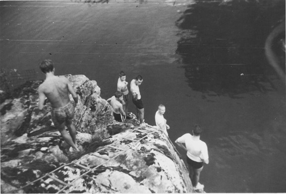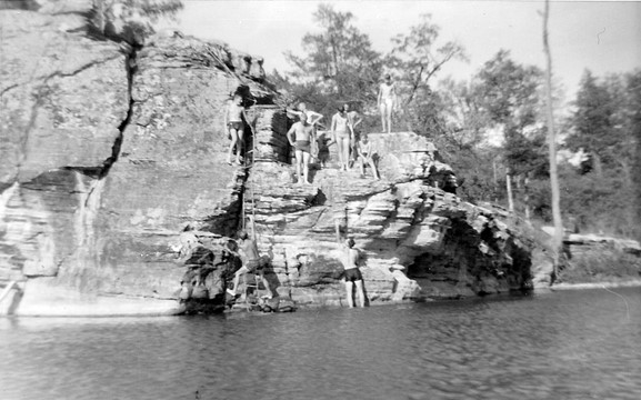 The Poag Hole was the perfect place for Troop 97 to camp and swim and we returned many times from 1960 all the way into the 70’s. Using our homemade Half Mile Cave rope ladder, we would climb up the bluff and jump in over and over again.