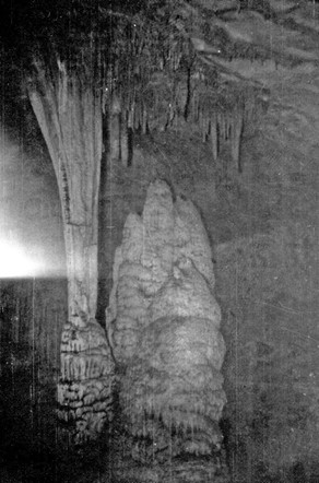 Each of these young men enjoyed this new world in the context of their own point of view. As a misstep by Billy mired him knee-deep in a large deposit of guano; Pug as a medical student, was concerned about the possibility of diseases spread by bats. Thus, not unlike the other explorations, every turn and step sparked a new comment of wonder and exclamation. Searching behind the travertine dam they were looking for any sign of aquatic cave life. Through vast passages filled with gigantic formations, old as time, and crawling through to the Rocket Room, they were able to observe a bat colony clinging to the high ceiling of the cave.