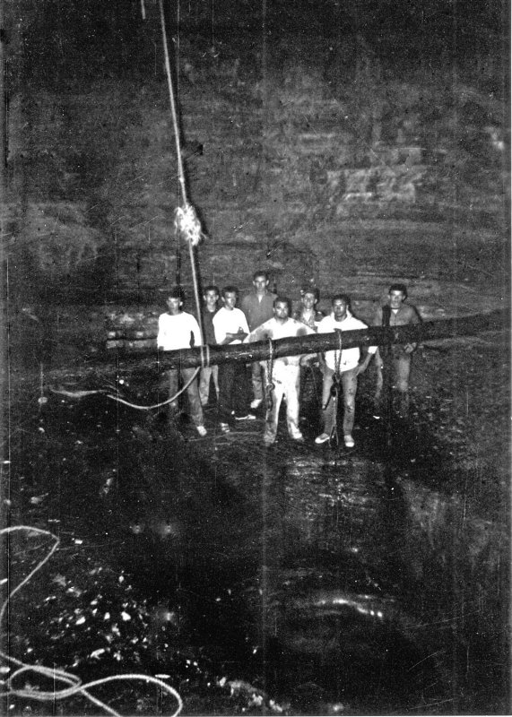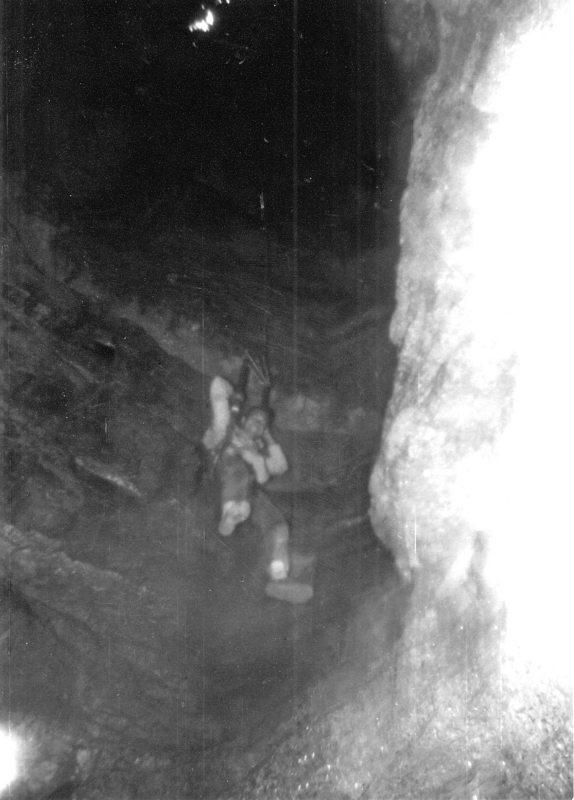 The week before their trip, all ropes and equipment were checked and the six soon to be new cave explorers were briefed on why and how it was needed. Nevertheless, when in the entry room, the phrase 75-foot natural cave entrance takes on a personal meaning. Honestly, it is a somber scene and was reflected in the timbre and body language of the five novices. To a 20-year-old, would-be cave explorer, it was like looking into an intimidating mouth of a bottomless pit. After a quiet but skillful job of rigging, each one was coaxed into the parachute harness, attached to a hand operated block and tackle and sent on his slow journey to the cave floor, probably the most apprehensive 75 feet of their young lives.