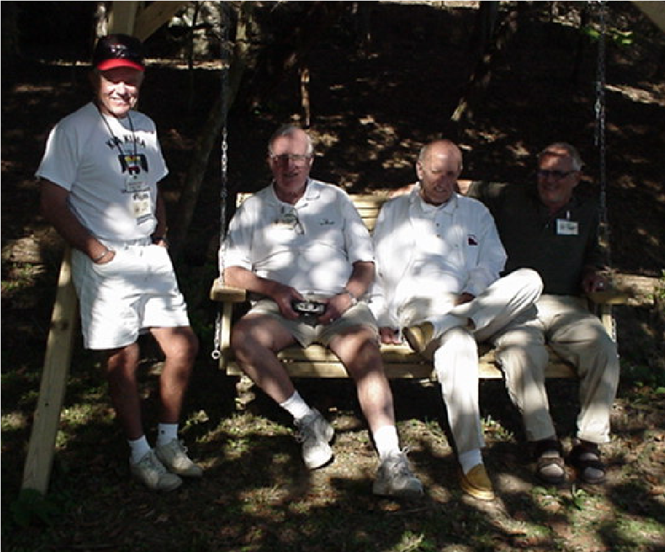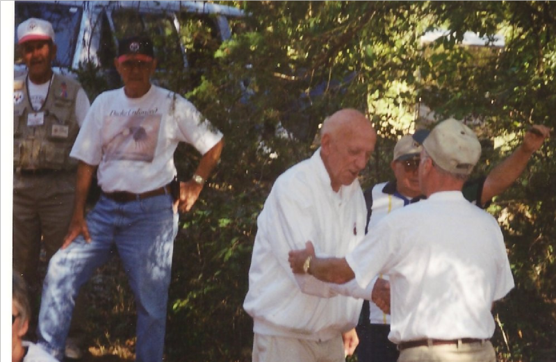 George was able the make a short visit to the 2001 reunion and was pleased to inspect his beloved old staff cabin for the last time. We set up a table and microphone on the concrete patio for any remarks George may have about his beloved Old Kia Kima. With a clear view of the waterfront he loved, we gave a hearty “How-How-UG” to our beloved waterfront director, “Uncle Dudley.” It was an excellent time for picture taking.