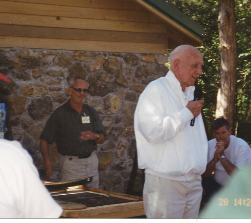 Our goal was to have the cabin at least partially completed before our OKKPA Reunion and hoped George would at least be able to make a short visit to the 2001 OKKPA Reunion. We surveyed the cabin and made an assessment of what should be done and plans to get started ASAP. This was my first time to go inside the cabin and immediately l knew my vision to remove all the additions including all the wood on the original stone cabin was correct. There was some debate that renovation of the additions would make a more useful cabin but a clear vision prevailed. The concrete slab of the added rooms would make a great patio for the addition of a deck. The OKKPA board accepted PREL’s offer, my vision and started renovation with a goal to complete as much as possible before the September 2001 reunion. Everyone agreed, this would make a perfect memorial to “Uncle Dudley” and the other staff who stayed in the historic “Rat’s Nest.”