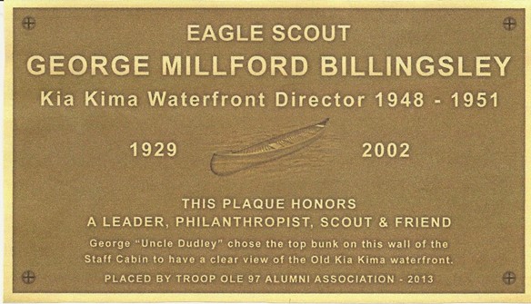 The last artifact to be installed was a bronze plaque donated by the Ole 97 Alumni Association. It was to be affixed on the concrete wall at eye level and easy to read where “Uncle Dudley’s” top bunk was during his time on the Kia Kima Staff. This position enabled George to have the waterfront in view while lying in bed. The plaque pictured an empty canoe, afloat, without its beloved canoeist.