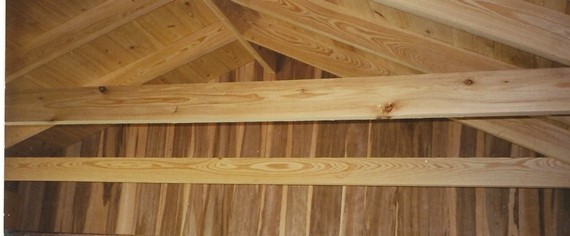 I presented Hsu’s email answer and my vision of making George’s cabin into a “Show Place” to everyone at the OKKPA April 2001 work week. I proposed the added-on rooms would have to go, a spacious deck added and all existing wood be replaced with native hardwoods. I proposed a pecan and hickory floor be added with Louisiana Cypress rafters, roof decking, wall and window framing and doors with the center gables paneled with Red Cedar and the inside end gables paneled in Sweet Gum with Hackberry trim. Use of these common southern hardwoods would bring warmth, beauty and personality to the simple cabin, showing an interest in detail that off the rack pine building material can’t imitate. The spacious deck would provide a great view of the Southfork and a good place to grill while looking at the Old Kia Kima waterfront, a view George loved and was visible from his top bunk on the inside wall of the “camp-side" room.