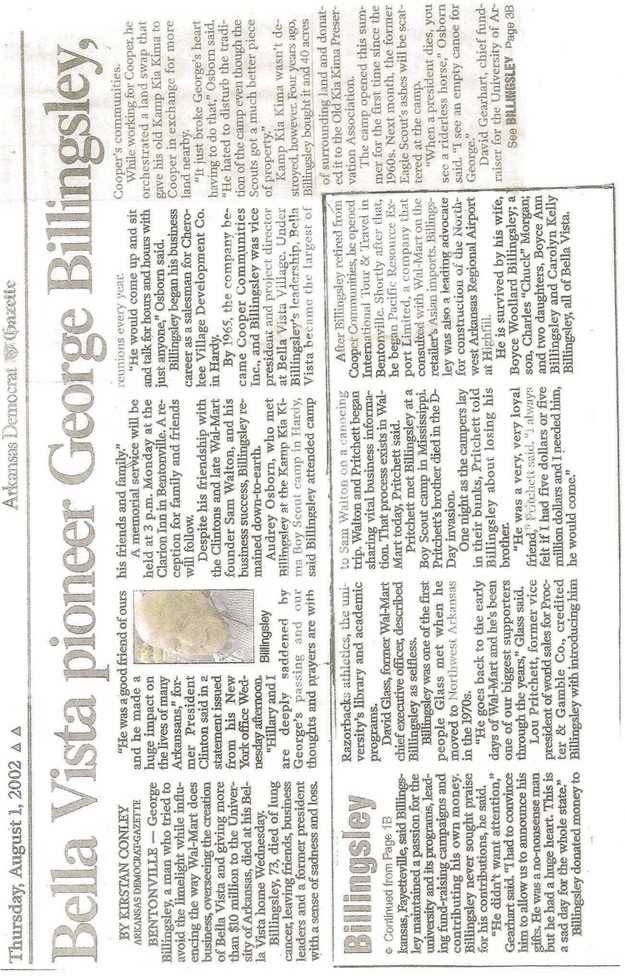 Forty-six years later, at the Old Kia Kima Preservation Association reunion at Cherokee Village in September 1997, I had a chance to talk with George. I shared with him my sales endeavors throughout Asia, marketing hardwood lumber. I knew he was involved with PREL, a company that supplied Walmart with much of their products. I wanted him to know that another OKK Scout was flying the friendly skies, knocking on doors and visiting the mysterious cities and countries of Asia.